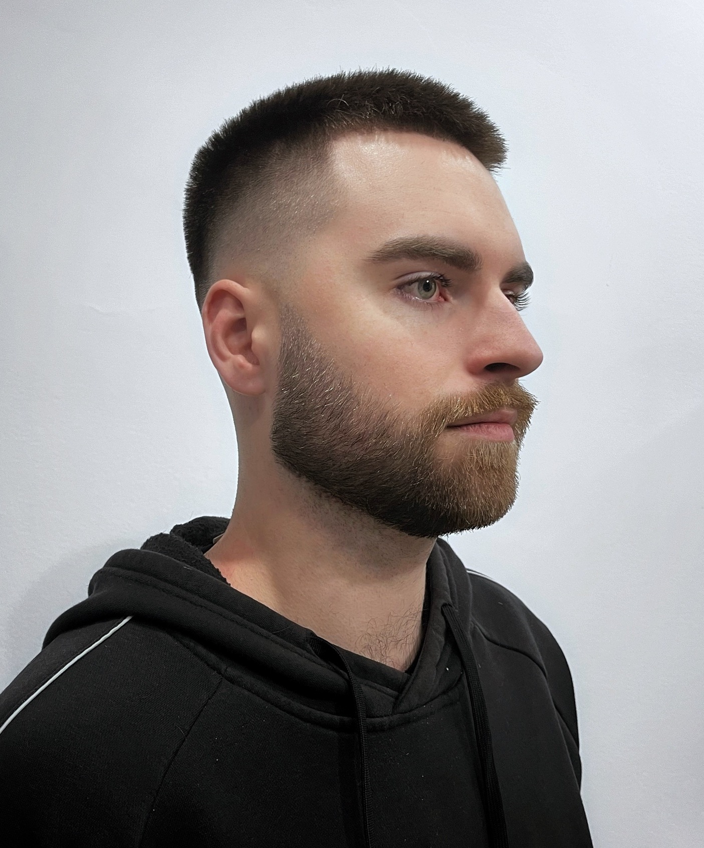 Una sfumatura bassa con una parte superiore strutturata offre un look moderno e sobrio, che si adatta alle forme del viso rotonde e quadrate. Una mousse leggera per lo styling può aggiungere volume e consistenza alla parte superiore, mentre appuntamenti regolari con il barbiere aiutano a mantenere il taglio ordinato e ben definito.